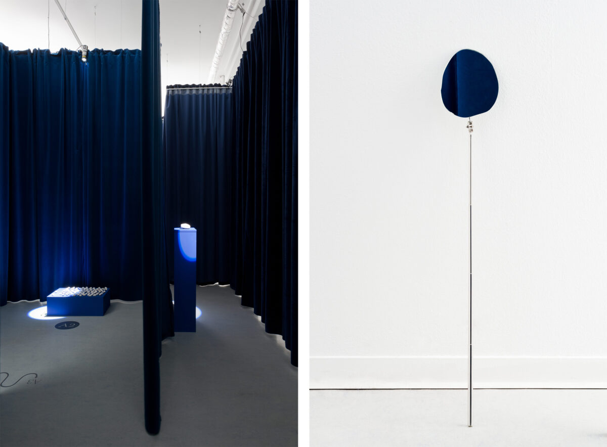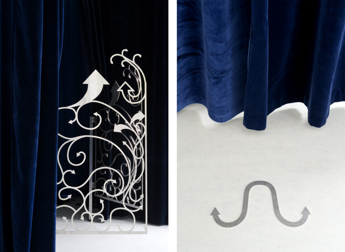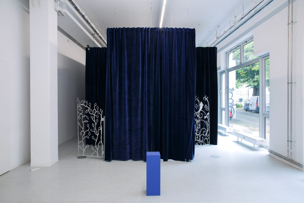 In her exhibition Dilemma, Gosia Lehmann transforms the project space Neun Kelche into a labyrinth. The toss of a coin decides which path upon which we embark. A floral steel gate and another made of arrows mark the two entrances to the blue maze, which, like a room within a room, hangs from the ceiling draped in velvet curtains. What riddles must be solved therein, and how do we find our way out of this Dilemma? An accompanying audio guide leads visitors through the installation.