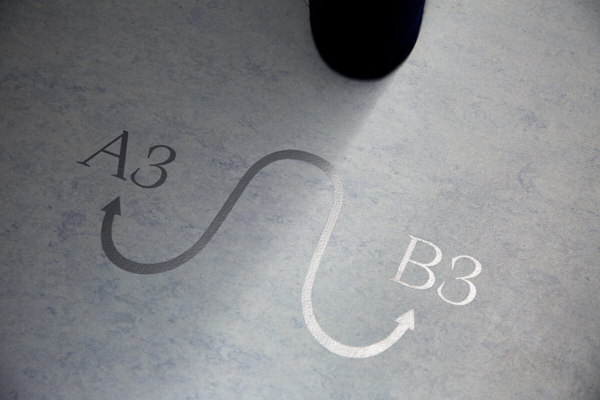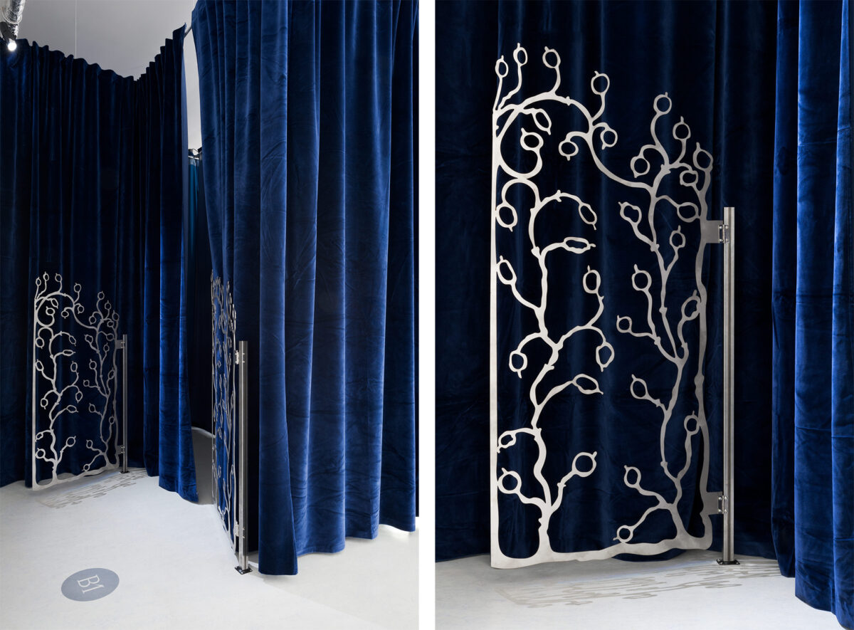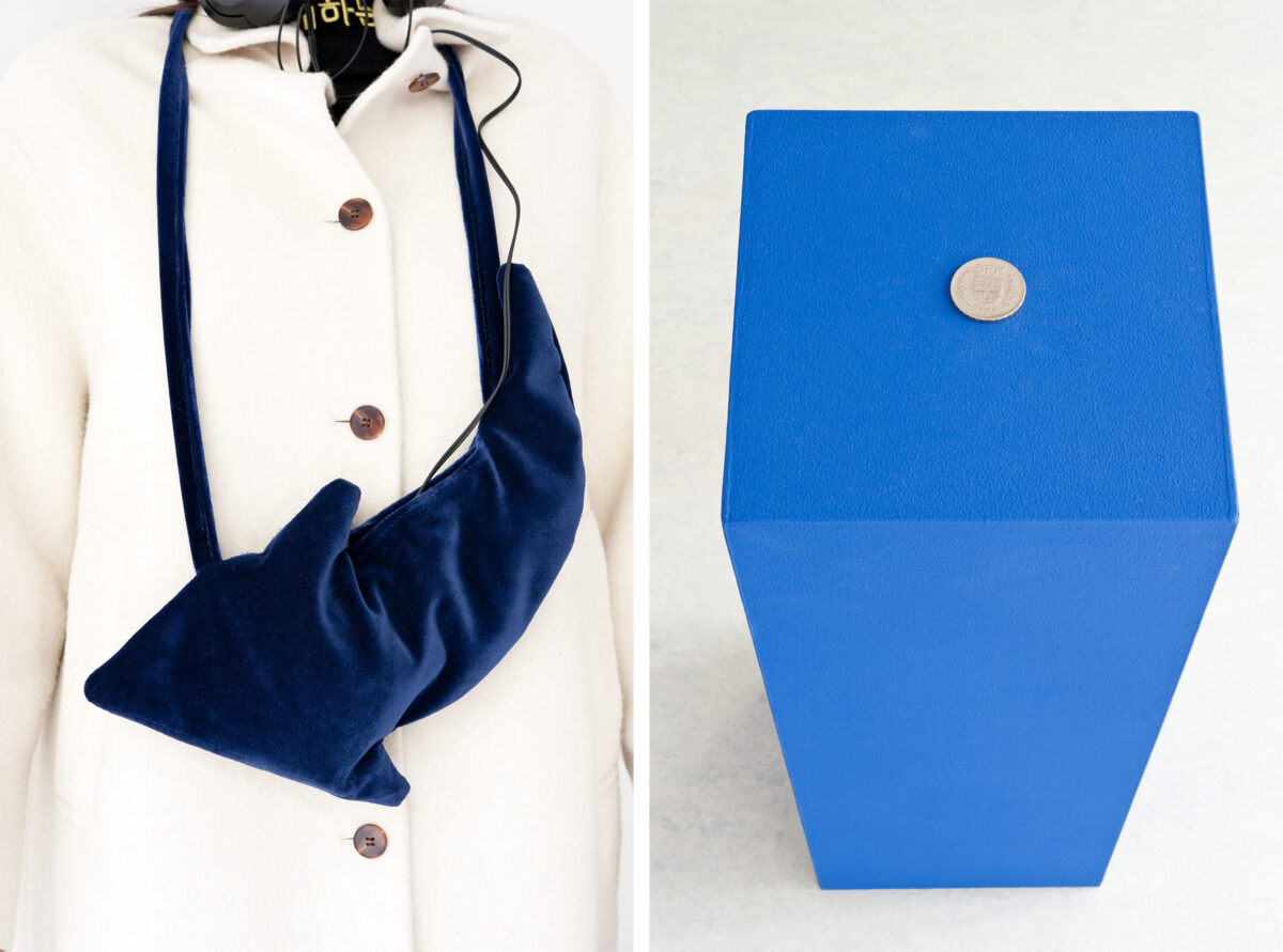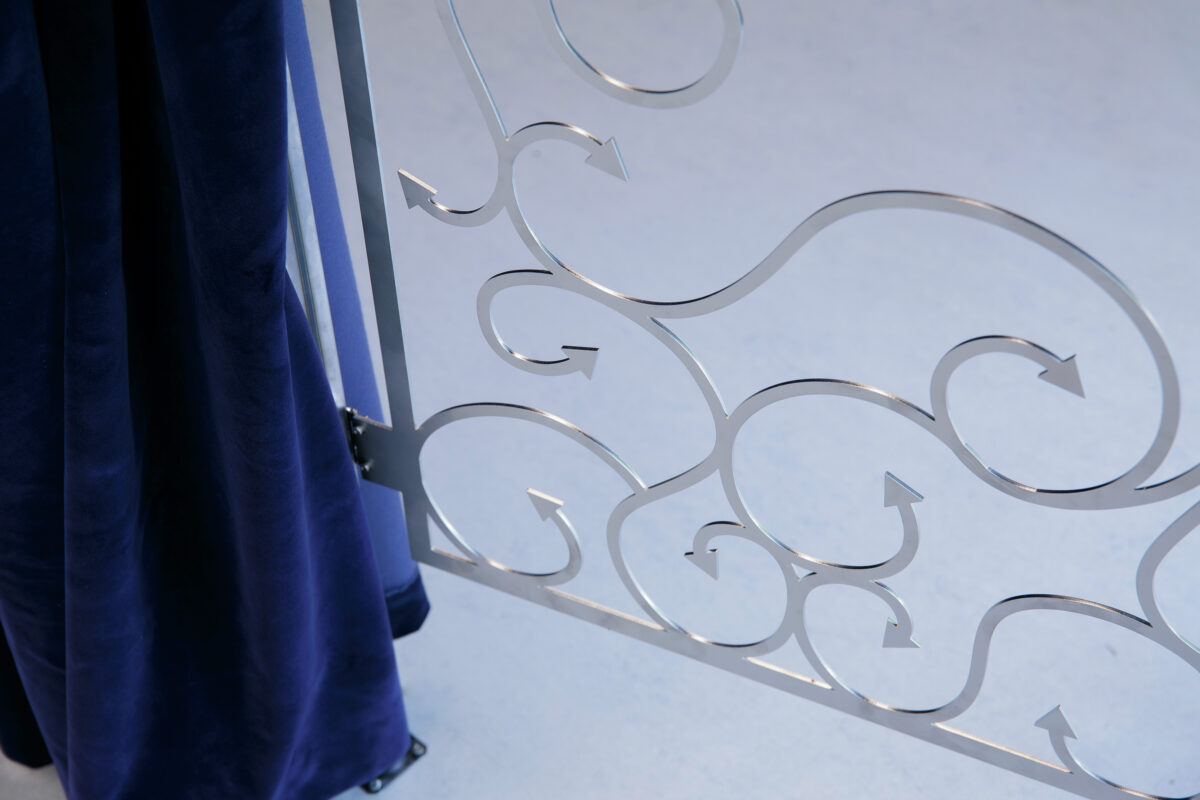 In her exhibition Dilemma, Gosia Lehmann transforms the project space Neun Kelche into a labyrinth. The toss of a coin decides which path upon which we embark. A floral steel gate and another made of arrows mark the two entrances to the blue maze, which, like a room within a room, hangs from the ceiling draped in velvet curtains. What riddles must be solved therein, and how do we find our way out of this Dilemma? An accompanying audio guide leads visitors through the installation.